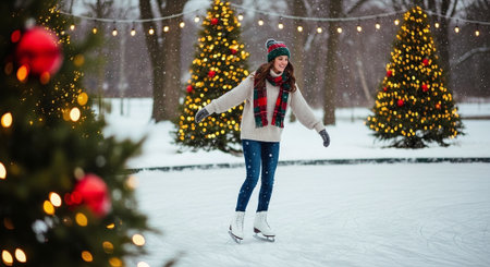 A young woman ice skating in a snowy park, wearing a cozy sweater, scarf, and hat, surrounded by decorated Christmas trees with lights