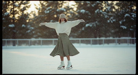 A woman ice skating in a snowy landscape, wearing a cozy sweater and a long skirt, with snowflakes falling around her