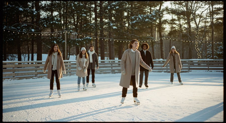 Friends are joyfully ice skating at a charming outdoor rink decorated with twinkling lights, creating a festive winter atmosphere before warming up with hot chocolate.