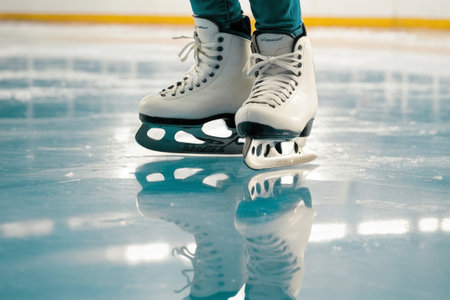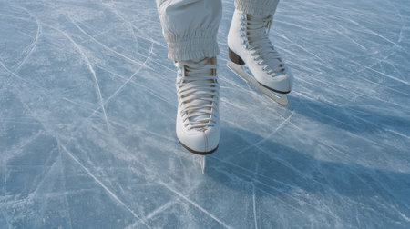 A captivating close-up view of a figure skater's white skates as they glide effortlessly over a beautifully maintained ice rink surface, showcasing the serene atmosphere of winter sports.