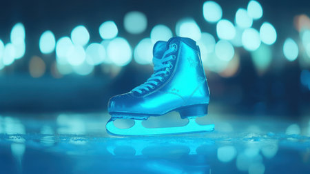 An artistic shot of a glowing ice skate placed on a reflective ice surface, complemented by soft bokeh lights in the background, evoking a sense of winter sport elegance.