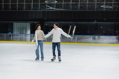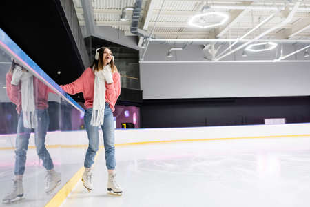 full length of positive young woman in white gloves and ear muffs and pink sweater skating on ice rink