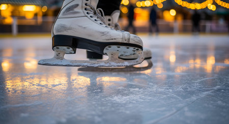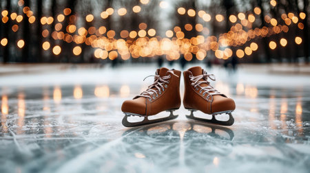 A captivating scene featuring vintage ice skates on a shimmering outdoor rink. Soft blurred lights create a magical winter atmosphere perfect for holiday joy.
