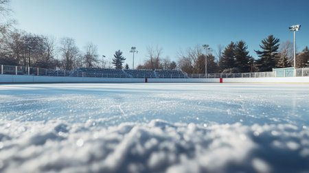 Empty outdoor rink surrounded by snowy stands, the smooth ice awaiting skaters under a clear sky.