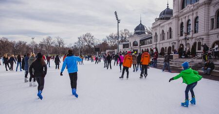 BUDAPEST, HUNGARY - DECEMBER 31, 2018: Many people spend their holidays skating in City Park ice rink in Budapest, Hungary