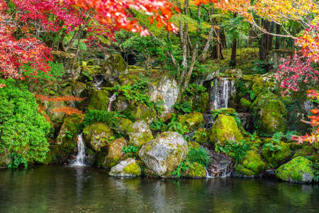 Beautiful autumn scene with waterfall and pond in garden, Japan