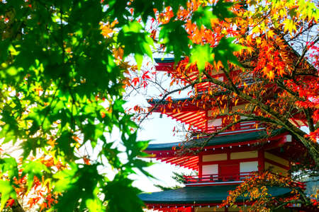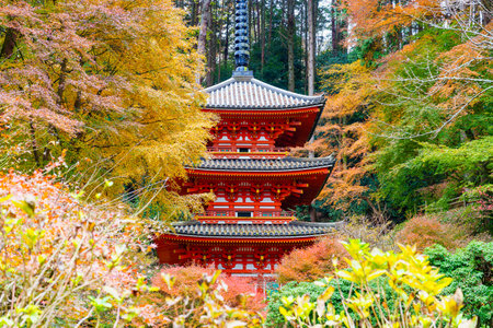 Japan in autumn. Red pagoda on the background of autumn leaves. Religious buildings in Japan. Buddhist temple on a Sunny autumn day. Travel to Japan. The Asian architecture.