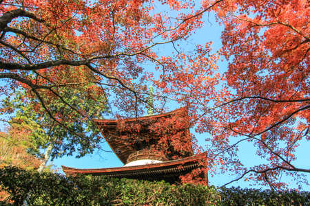 Japanese temple with red maple leaves in autumn season