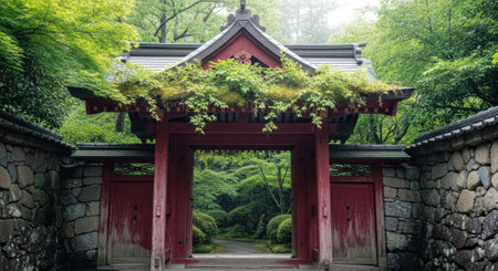 A striking red torii gate marks the entrance to a tranquil garden, surrounded by stone walls and abundant foliage.