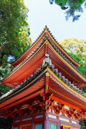 Narita, Japan 17 March, 2018: The Daitou, or Great Temple, built in 1984, stands over 58 meters tall on the top of Narita Mountain. The Narita-san temple, also known as Shinsho-Ji (New Victory Temple), is Shingon Buddhist temple complex, first established