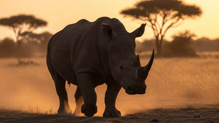 A rhinoceros walks through dust at sunset in the African savanna with acacia trees in the background.