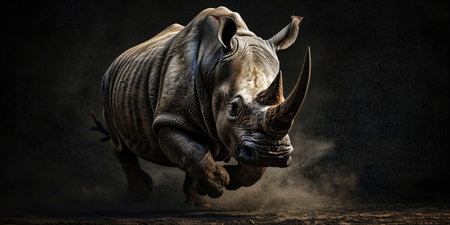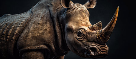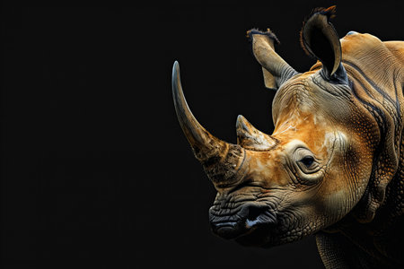 Wallpaper rhinocero on the black background. Isolted rhino on black. Popular african animal. Prepare for use. Proposal for web, banner, website, work, article, protected, save, enviroment.