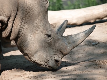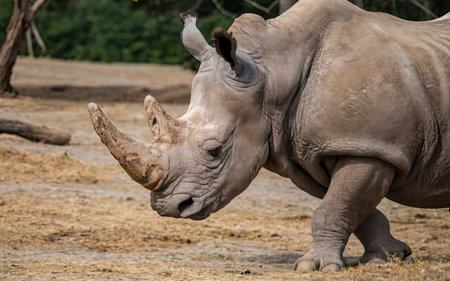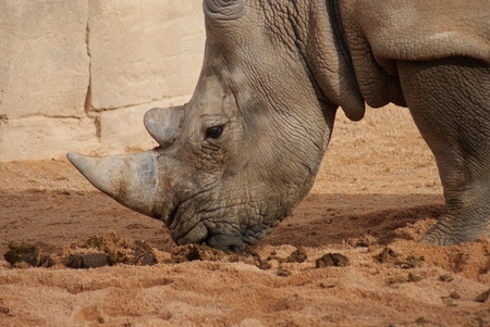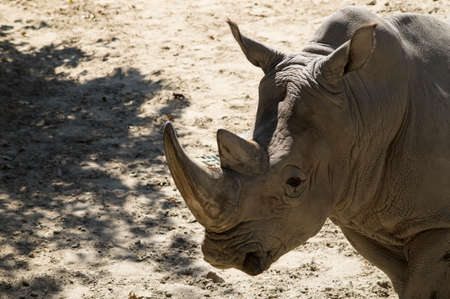 portrait of captive white rhinoceros (Ceratotherium simum).