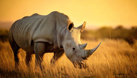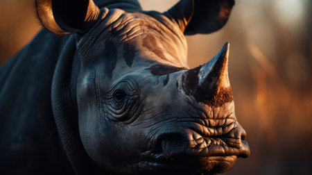 Witness the enchanting beauty of nature as a majestic rhino basks in the tranquil embrace of an autumn landscape Captured in exquisite detail, this wildlife photograph unveils the serene grandeur of nature's remarkable creations The play of shadows and the warmth of autumn hues evoke a sense of peace and wonder, painting a captivating portrait of the harmonious bond between wildlife and its environment AI Generative