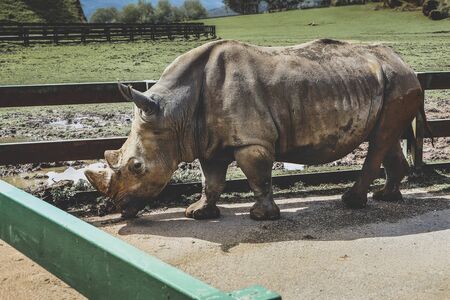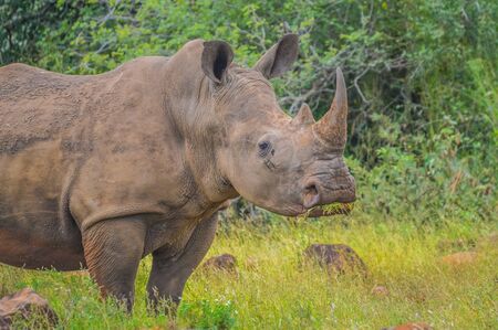 Male bull Cute White Rhino or Rhinoceros in a nature wild reserve in South Africa