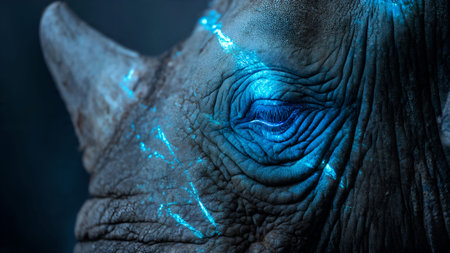 Close-up of a rhino's face with a striking blue light effect, highlighting its eye and skin texture.