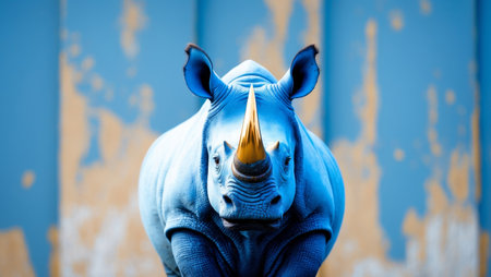 AI Generated. A blue rhino with a golden horn stands in front of a blue wall