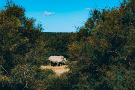 White rhinoceros walking through dry bush landscape under blue sky. Wildlife safari scene showing endangered species in natural habitat, conservation and biodiversity. High quality photo