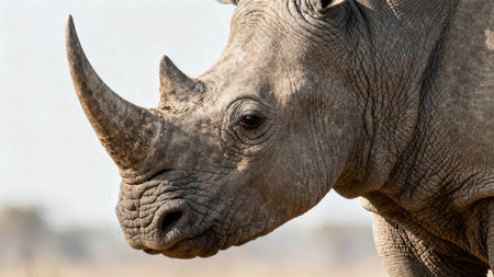 Majestic black rhinoceros in profile, highlighting powerful horns and detailed skin texture