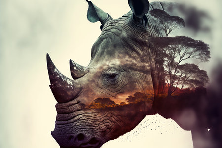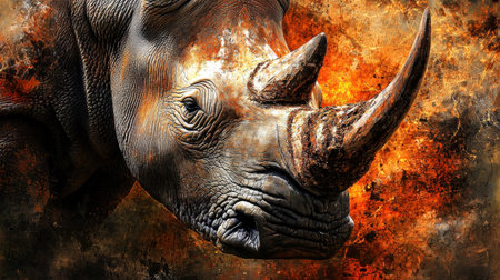 A striking close-up of a rhinoceros head, showcasing its impressive horn and textured skin against a vibrant, dramatic background. Ideal for wildlife enthusiasts.
