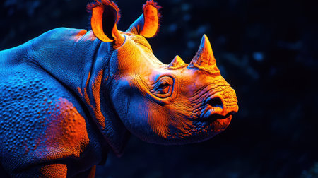 A striking image of a rhinoceros captures its unique features illuminated in vibrant blue and orange hues. The animal's profile showcases its majestic presence in nature, emphasizing the beauty and urgency of wildlife conservation.
