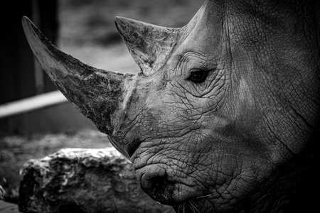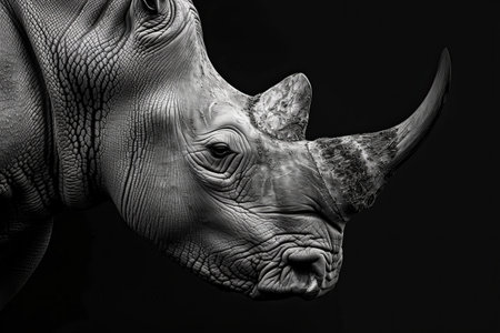 White rhino in black background, high contrast, low light, grayscale, headshot photography, silhouette