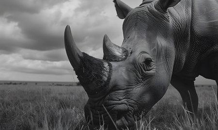 Monochromatic image of a rhinoceros grazing in field under the sky