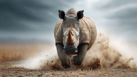 A powerful rhinoceros charges across the dry savanna, creating a cloud of dust against a dramatic sky, showcasing the raw beauty of wildlife.