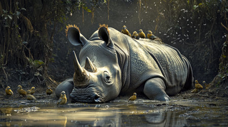 A serene image of a Javan rhino lying down near a waterhole, surrounded by small forest birds.