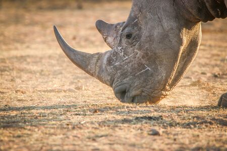 Portrait of a male bull white Rhino grazing in Etosha National park, Namibia. Wild african animals. Close up of a rhino