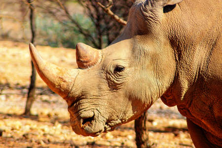 Wild african animals. Portrait of a male bull white Rhino grazing in Etosha National park, Namibia.