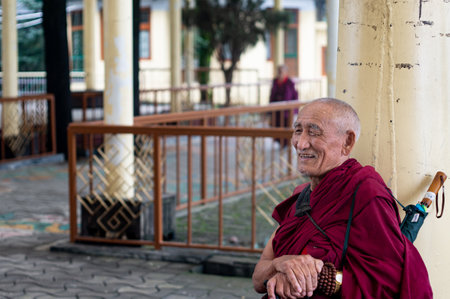 New Delhi, India - December 2021: Portrait of Indian tibetan monk lama in red color clothing at tibetan monastery area.