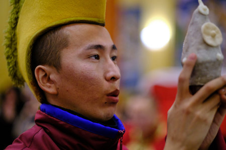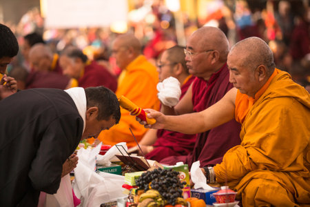 St. Petersburg, Russia - February 03, 2019: Buddhist religious rite of preparation for the New Year's meeting in Datsan. Dugzhuba Purification Ritual