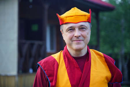 Tibetan Buddhist monk teacher in a burgundy yellow outfit suit