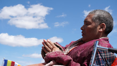 LHASA, TIBET, CHINA - AUGUST, 17 2018: Tibetan monks in the Ganden Monastery located at the top of Wangbur Mountain, Lhasa Tibet