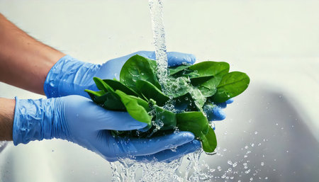 Hands in rubber gloves holding fresh green spinach in water, closeup