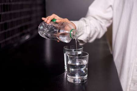 Pour clean drinking water from the bottle into the glass.