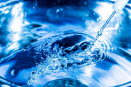 Experiments and experiments in the laboratory. A scientist in yellow gloves conducts chemical analysis and tests. The work of a doctor, beautician and researcher. Medicine and biochemistry