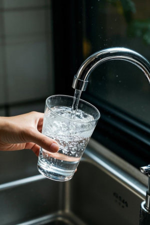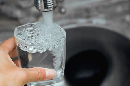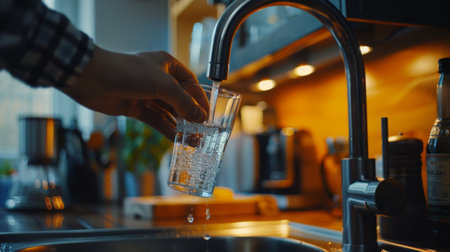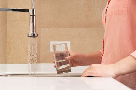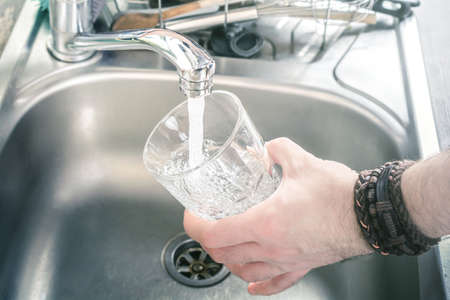 Filling a glass with fresh, clean drinking water from the kitchen tap for a refreshing drink