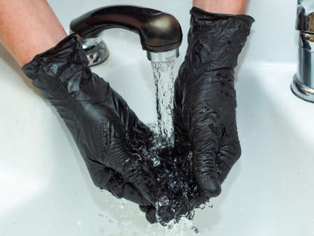 Stylist washing hands in washstand, close up view. Stylists hands in black rubber gloves. Photographed in barbershop. Selective soft focus. Blurred background