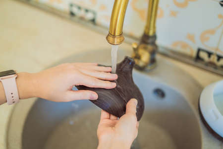 Woman washing aroma diffuser in faucet. Aromatherapy Concept. Wooden Electric Ultrasonic Essential Oil Aroma Diffuser and Humidifier. Ultrasonic aroma diffuser for home