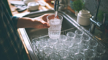 Close-up of a woman holding a glass and filling a kitchen sink with water from a faucet. Cleaning and hygiene concept.
