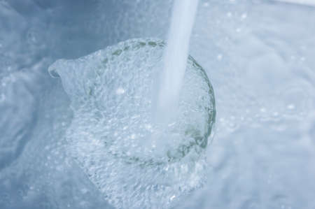 A stream of water flows into a glass cup close up