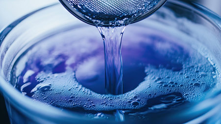 This captivating image features water being poured through a mesh strainer into a clear glass bowl, creating bubbles and ripples in a vibrant blue hue. The detailed close-up showcases the freshness and purity of the liquid as it interacts with the strainer, emphasizing a modern culinary environment. Perfect for cooking, beverage preparation, or kitchenware themes.