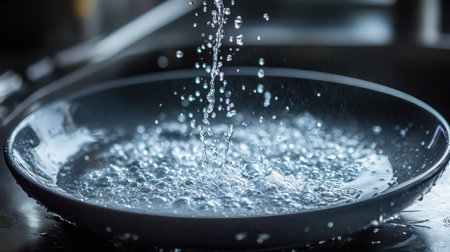 A vibrant image showcasing water flowing from a kitchen faucet into a sink, surrounded by soap suds and utensils, symbolizing daily household activities and hygiene.