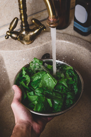 Hands of Chef Washing Fresh Spinach Leaves in Marble Sink