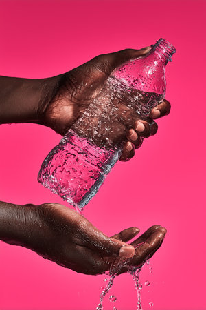 Two hands capture a vibrant moment as water splashes from a bottle, set against a striking pink background.