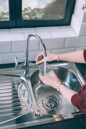 Female hands pouring water from the tap into a glass in the kitchen