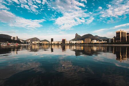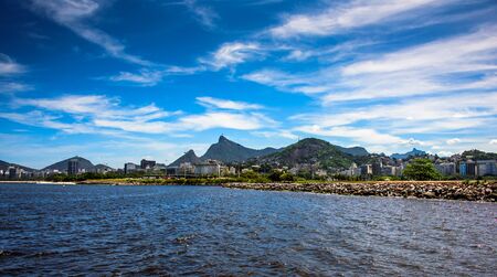 Cityscape view of Guanabara Bay and embankment at sunny day with blue sky, white spindrift clouds and Christ the Redeemer on the background in the city of Rio De Janeiro, Brazil