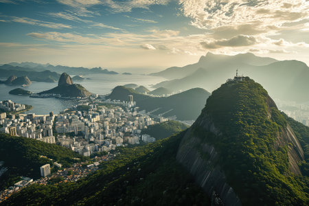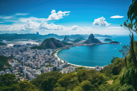 Behold the awe-inspiring panoramic view of a vibrant city meeting the vast expanse of the ocean in one breathtaking scene, Panoramic view of Rio de Janeiro from atop Sugarloaf Mountain, AI Generated